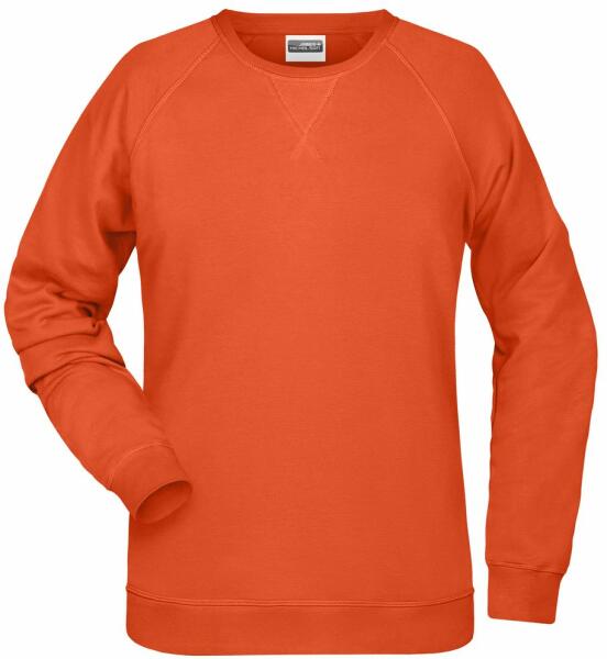 Klasszikus női pulóver biopamutból, raglan stílusú ujjakkal, kerek nyakkivágással és dekoratív varratokkal. A derék rész kissé ívelt. Kiváló minőségű kötött anyagból készül: 85% organikus pamutból és 15% poliészterből, súlya 300 g/m2.