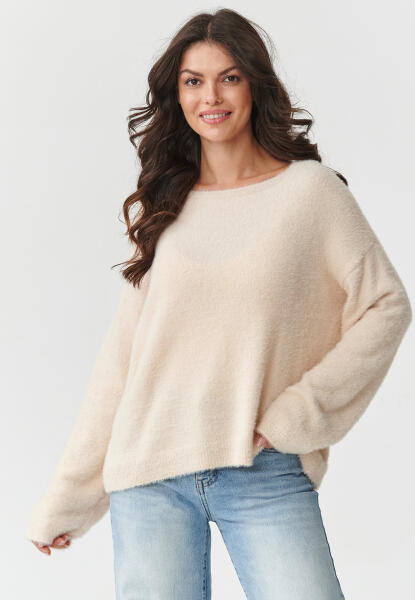 Ez a 100% poliamidból készült női pulóver a modern dizájnt ötvözi a kivételes kényelemmel. Puha tapintású és bolyhos, a pulóver puha takaróként öleli körül a testet, és kellemes meleget biztosít a hidegebb napokon. A laza szabásvonal enyhén ejtett vállal könnyedséget és lazaságot kölcsönöz neki, így ideális hétköznapi és alkalmi viseletre egyaránt. A klasszikus csónaknyak-kivágás tovább hangsúlyozza a vállak és a nyak nőies vonalát, míg a puha szegéllyel ellátott bő ujjak egész napos kényelmet biztosítanak. Farmerrel, szoknyával vagy leggings-szel ideális, ez a modell gyorsan a ruhatárad alapdarabjává válik. Összetétel: 100% poliamid Egy méret Mellbőség2x50Alsó szélesség2x52Hossz58