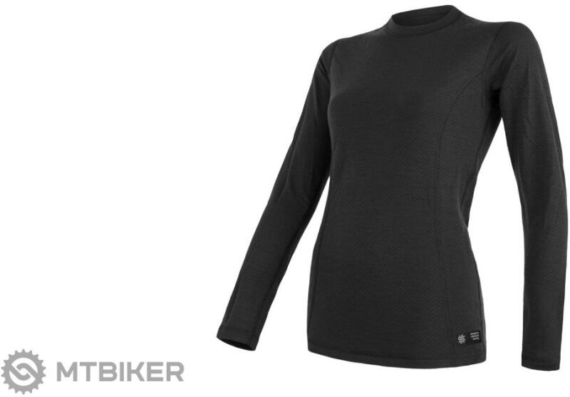 Egyedi felépítésű kötött anyagból készült hosszú ujjú női póló, mely zseniálisan ötvözi a merinó és a szintetikus anyagok világának legjavát - kiváló minőségű merinó gyapjú és végtelen típusú poliészter szál.