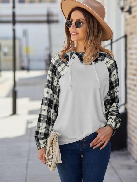 Shein KC45120 Shein Kockás Női Kapucnis Pulóver, MALLEGRO