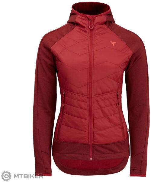 A női hőszigetelt kapucnis pulóver nagyon meleg, kellemes fésült gyapjúból készült. Az egész elöl, a vállakon és a veséken légáteresztő szélálló anyag védi a gyapjút, így megfelelő körülmények között kabátként is viselhető a pulóver. Hátul két zseb található az apróságok tárolására.